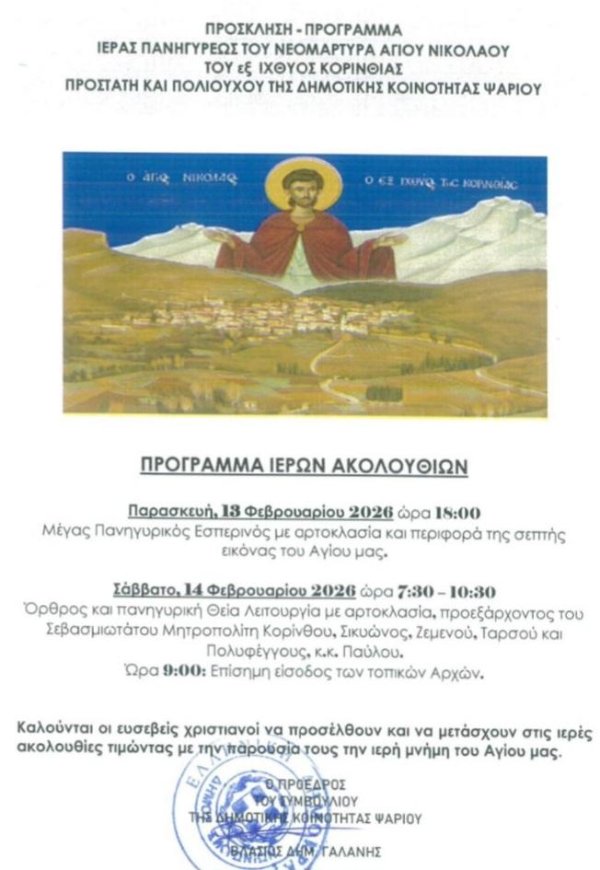 | 2/2/2026 | Πρόσκληση – πρόγραμμα της Κοινότητας Ψαρίου για τον προσεχή εορτασμό της μνήμης του Νεομάρτυρα Αγίου Νικολάου του εξ Ιχθύος της Κορινθίας